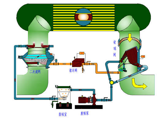 四、中央空調膠球清洗裝置工作原理 中央空調膠球清洗裝置選用合適的膠球--剝皮膠球--硅化膠球--金鋼砂膠球,將膠球從裝球室手孔處投入裝球室內,投球數量為主機[冷凝器|蒸發(fā)器]冷卻水管數的10%左右。先打開(kāi)收球網(wǎng)的收球閥和投球閥,關(guān)閉放水閥,然后啟動(dòng)膠球泵,再打開(kāi)裝球室上的排氣閥,排完裝球室內的空氣,關(guān)閉排氣閥,當冷卻水正常運行時(shí)慢慢打開(kāi)裝球室的切換閥,切換閥不宜過(guò)猛切換,過(guò)猛切換會(huì )導致[投入球數量過(guò)多]收球網(wǎng)堵球。膠球在冷卻水流帶動(dòng)下進(jìn)入凝汽器水室。膠球在冷卻水進(jìn)出口壓力差的作用下跳動(dòng)洗刷冷卻管內泥沙污物,對冷卻管內進(jìn)行一次有效抹擦,使冷卻管內壁泥沙污垢隨著(zhù)水流帶出,膠球經(jīng)冷卻水的帶動(dòng)下進(jìn)入收球網(wǎng),收球網(wǎng)將膠球分離出來(lái),膠球泵將膠球重新吸入裝球室,按此規律往復循環(huán)對中央空調主機[冷凝器|蒸發(fā)器]冷卻水管進(jìn)行連續清洗,運行時(shí)間一般控制在≥40分鐘 。